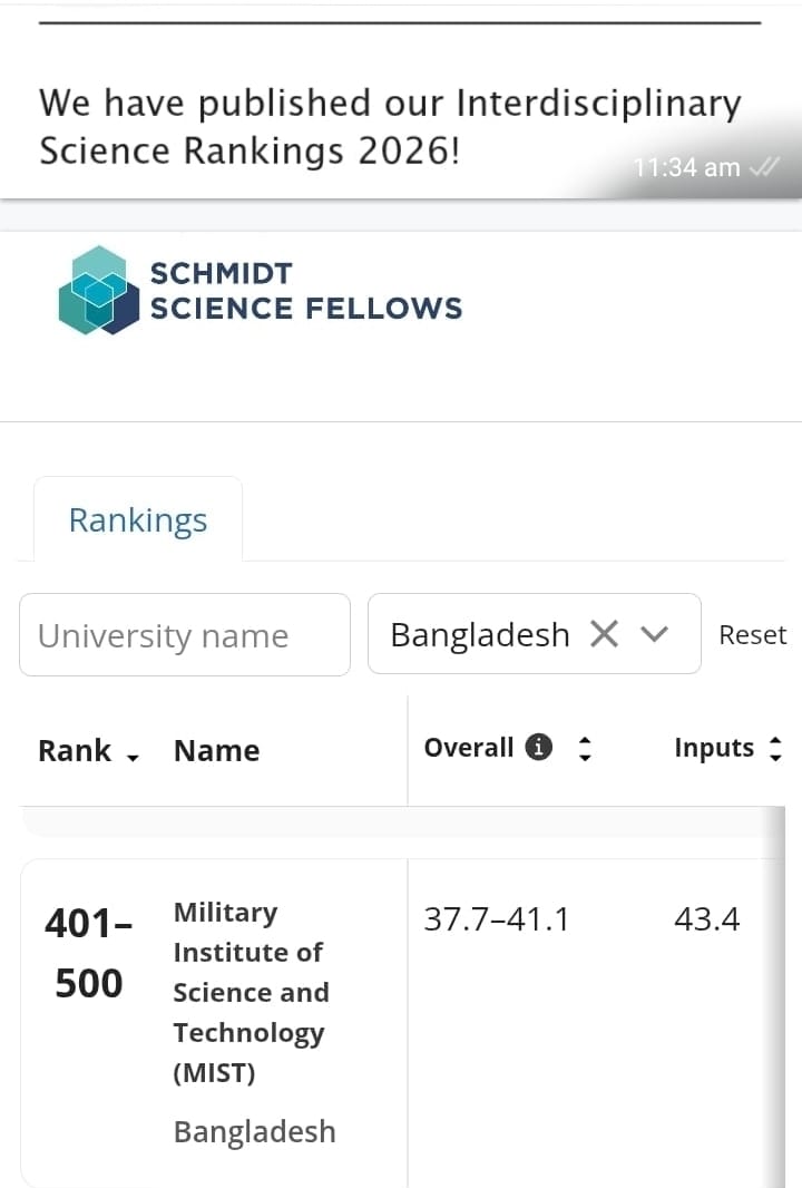 MIST has reached a remarkable milestone by being ranked in the Times Higher Education (THE) Interdisciplinary Science Ranking 2026 for the first time in its history. MIST secured a global position in the 401–500 band, placing 6th in Bangladesh, among a total of 1,267 universities that applied from 94 countries. Out of these institutions, 911 universities were ranked while 356 received Reporter status. This achievement reflects MIST’s strong and growing presence in interdisciplinary research, academic excellence, and global innovation. It is truly a proud moment for the entire MIST community.